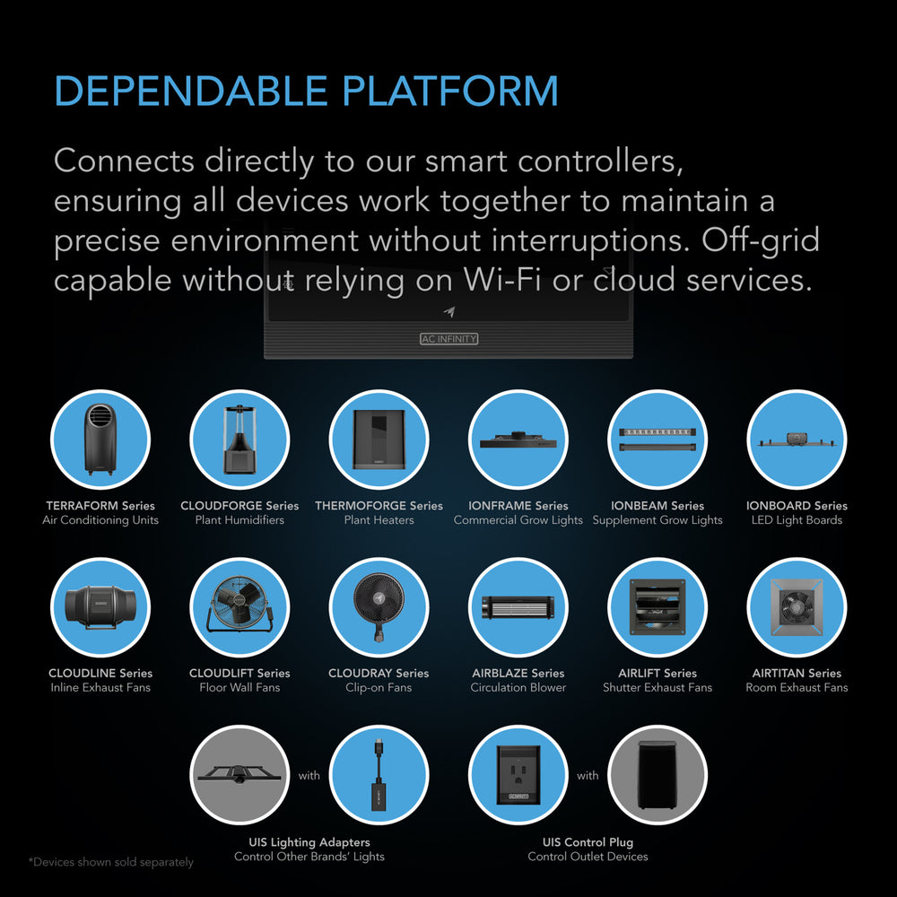 This intelligent humidifier is engineered for all-season performance, delivering precise vapour output to help maintain ideal humidity levels for year-round plant growth. Capable of warm mist output, it improves moisture distribution in cold environments where humidification is inefficient, reducing water usage while achieving optimal moisture levels. In addition, it utilises an advanced UV-C sterilisation system to purify the water supply before misting, promoting a cleaner and healthier grow environment. The misting is powered by a next-gen EC ultrasonic vaporizer with 10 levels of hot and cold mist for ultra-precise, customisable humidity control. Smart programming features VPD and humidity triggers, timers, auto-start with backup memory, and a backlit display that can be turned off to prevent night cycle disruption. This product is a part of the UIS™ platform of grow devices and smart controllers, designed to unite with the AC Infinity app over WiFi to achieve your ideal environment.