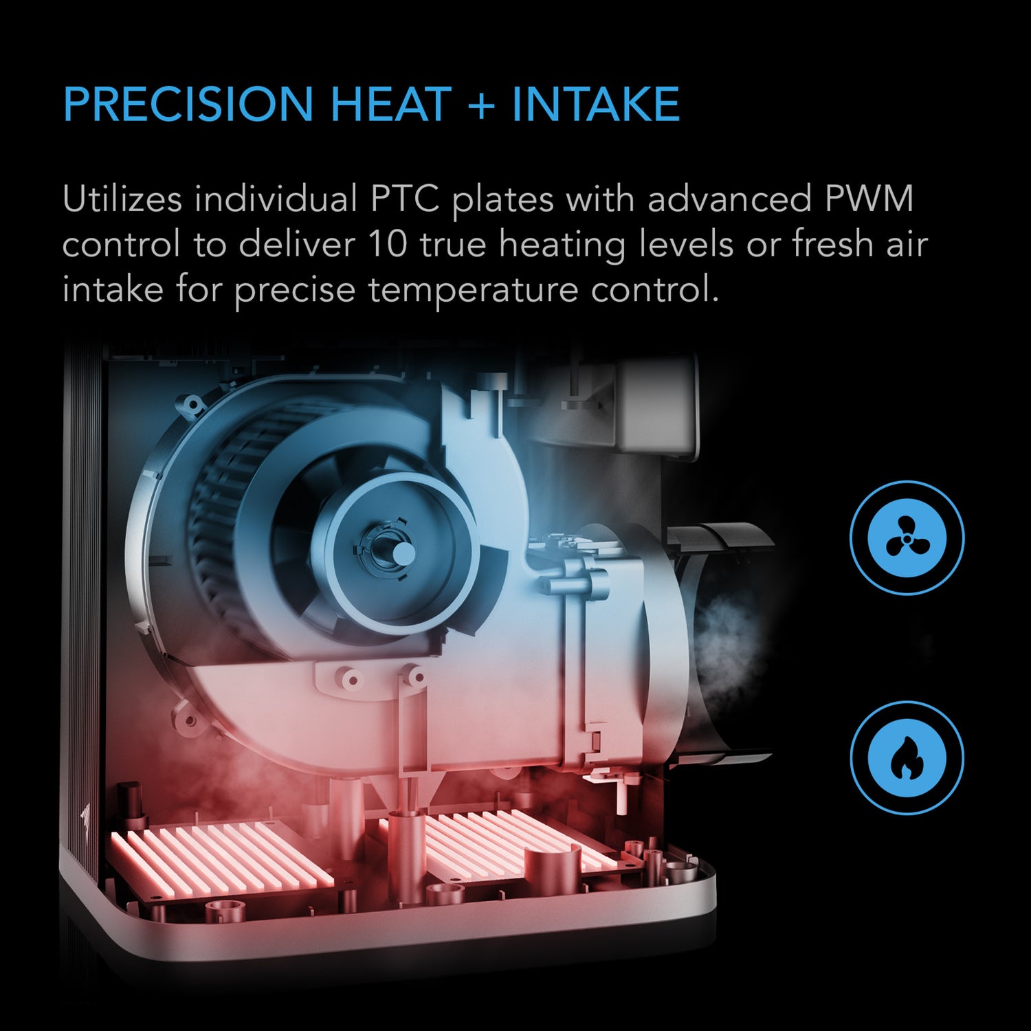- Utilizes individual PTC plates with PWM control to deliver 10 true heat levels or intake fresh air for balanced climate control.