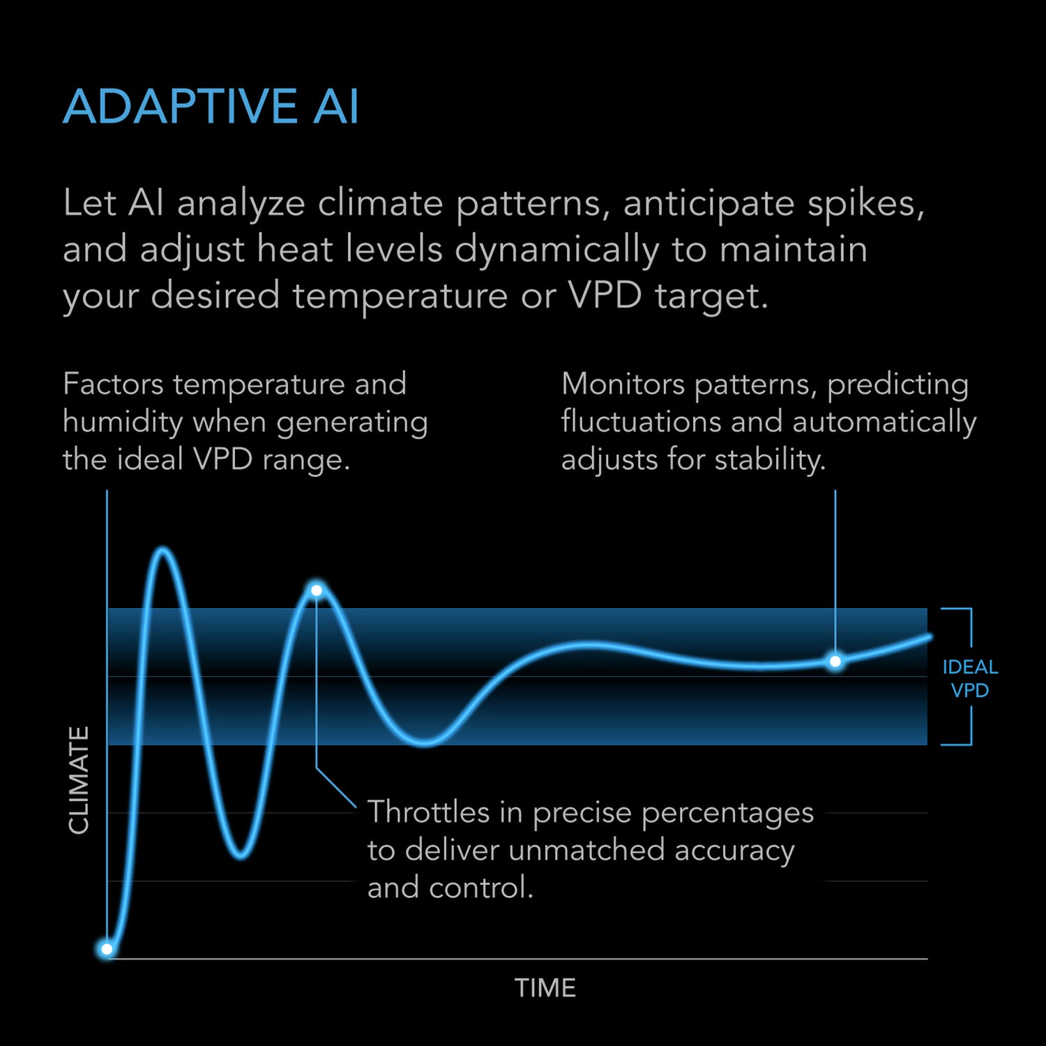 - Temperature and VPD programming powered by adaptive AI that dynamically adjusts output to maintain your target environment.