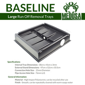 The Baseline Run-Off Trays and Systems were developed for growers who want effective nutrient run-off removal following feeding. By removing the residual feed solution away from your plant's roots, you'll be protecting your root zone from the build-up of pathogens and salts, ensuring oxygen availability and avoiding root rot.