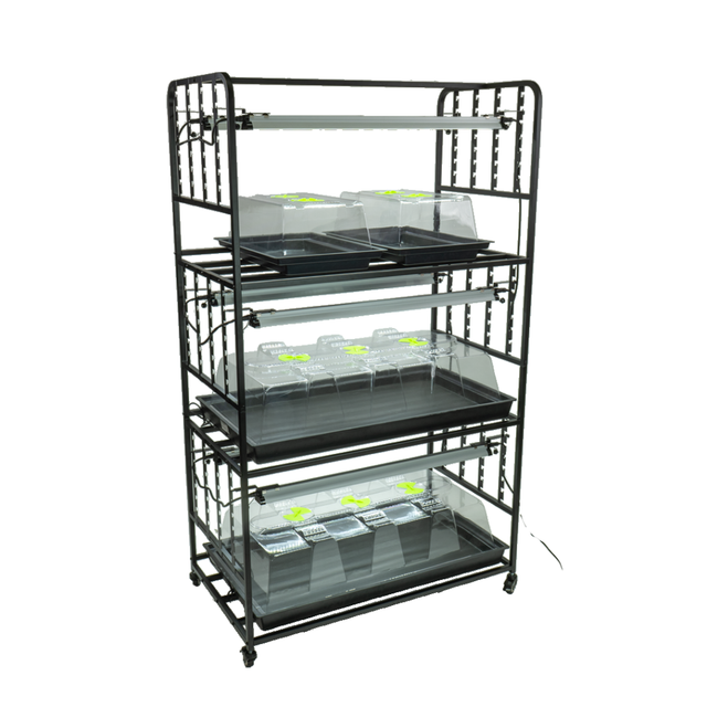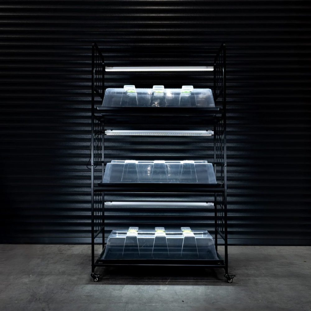 Whether you're growing micro-greens, maintaining a library of genetics, preparing for that next growing cycle or even just displaying exotic house plants, this racking system can help to manage all of this - providing multiple large surface areas with height-adjustable light hanging points and smooth-glide protractable shelving. Comes with locking castor wheels for easy mobility.