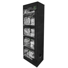 Our Propagation tents are suitable for all stages of plant growth, from seedlings to early veg and full life-cycle. They are equipped with sturdy shelves, individual drip trays, and shelf hangers, and feature clear doors for easy viewing without disrupting the temperature or humidity of the grow environment. These tents are packed with numerous benefits and features, and are simple to assemble while providing a strong and stable construction. The tents are constructed with top-quality materials, including 600D oxford black cloth and 620D diamond mylar interior surfaces, which increase reflectivity and optimize light distribution for plants. With heavy duty steel poles and reinforced corners, these tents are built to withstand tears and wear.