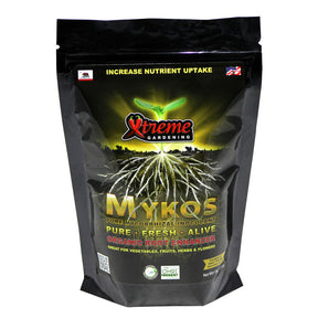 Mykos mycorrhizae is a natural and organic species of beneficial soil fungi that creates a “sponge-like” mass which collects and stores nutrients and water, increasing the uptake of both. This single species of arbuscular mycorrhizal fungi contains only Rhizophagus intraradices, formally known as Glomus intraradices. Mykos does not contain any other microbes such as trichoderma or ecto-mycorrhizae.